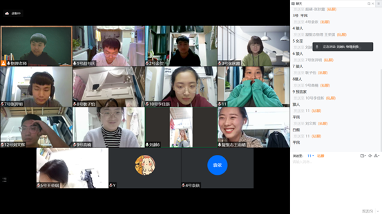 此次“心灵沟通”活动自愿报名参加,于2022年3月23日下午19:00采用腾讯会议举行,主要目的是通过线上互动使大家的寝室生活不再枯燥。本次活动由物理学院王雨晴同学担任主持人,设置了“摇摆时钟(热身)、狼人杀、说说烦恼及解决办法、”等三个环节。在活动中,同学们积极参与,相互交流和和互动,心理得到了很好的放松。