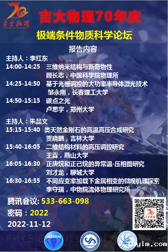 吉大物理70年-极端条件物质科学论坛(16-22) 报告时间:2022-11-12 14:00 pm 腾讯会议: 533-663-098 密码:2022 1.报告题目:三维纳米结构与新奇物性 报告人:顾长志,中国科学院物理所 2.报告题目:基于光栅调控的...